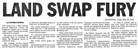 LAND SWAP FURY Airport ReserveBy Chris DewhurstMay 28, 1999THE approval for a land exchange between Bankstown Council and Bankstown Airport Ltd at Tuesday night’s council meeting was rowdily condemned by residents.